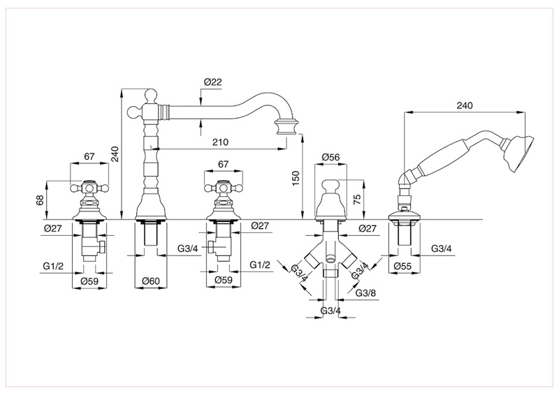 Bugnatese Arcadia 8380 - peremre szerelt 5 üléses kádcsaptelep