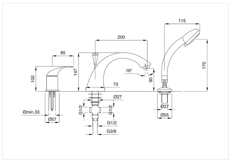 Bugnatese Venus 8750 - peremre szerelt 3 üléses kádcsaptelep